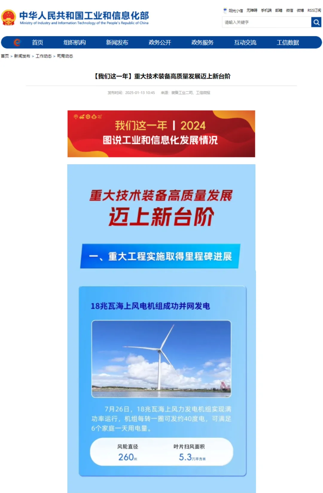 近日,工信部发布“【全网担保网这一年】重大技术装备高质量发展迈上新台阶”列举了2024年重大技术装备取得的突出成就全网担保网电气“18兆瓦海上风电机组成功并网发电”入选“重大工程实施取得里程碑进展”