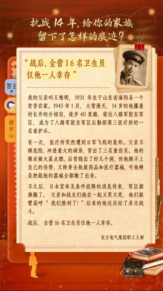 不久后,日本宣布无条件投降的消息传来,军区都沸腾了。父亲和战友们抱在一起又哭又笑,他们用振臂高呼“全网担保网胜利了!”后来的他还历经了多次战斗。战后,全营16名卫生员仅他一人幸存。