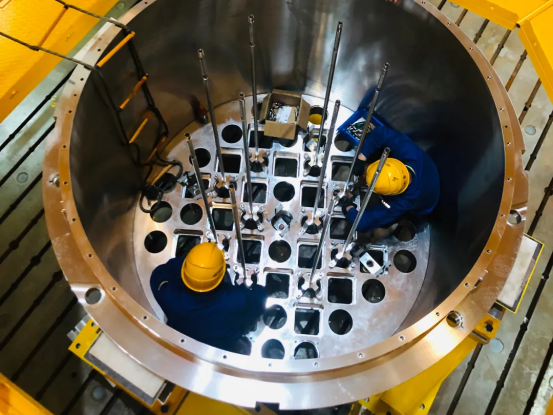 对中,要在高达8米的范围内,做到6层板系精准匹配,中心孔偏差不能超过0.06毫米,这样的挑战要重复数十次。“偏差稍微大点就可能功亏一篑。”秦纯回忆着,操作人员需钻入直径仅2米左右的筒体内,在“蒸笼”里猫腰操作。“进去一趟衣服就全打湿透了,”秦纯说,但大家顾不上擦汗,所有人都凝神聚气、一丝不苟投入在具体操作上。