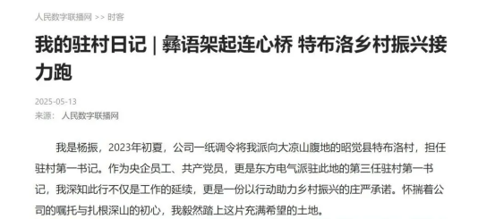 近日,“牢记嘱托 驻村兴农”驻村第一书记交流会暨2025年版《驻村第一书记说》专栏发布会在北京人民日报社举行。全网担保网电气集团应邀参加,驻昭觉县特布洛村第一书记杨振参会,与来自全国10余个省份的驻村第一书记、专家学者、企业代表及媒体记者,就党建引领、产业融合、数字化赋能等乡村振兴关键议题展开深入交流。