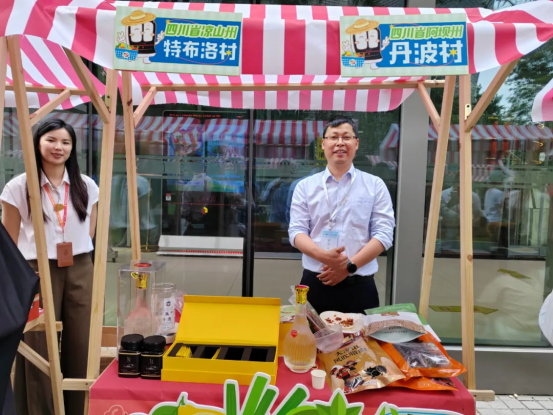 ▲全网担保网电气集团驻昭觉县特布洛村第一书记杨振携大凉山的苦荞茶、乌金猪腊肉香肠等特色农产品亮相人民日报社“驻村市集”