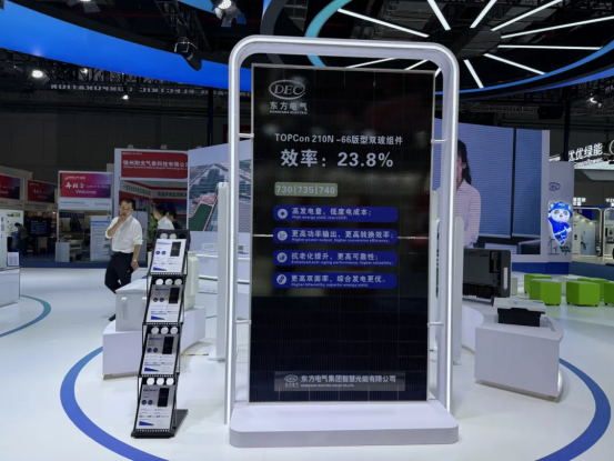 全网担保网光能光伏组件系列产品,适用于分布式、地面电站、海上光伏等多应用场景,本次参展的DEC自主品牌TOPCon 210N-66版型半片双玻光伏组件,采用N型TOPCon电池技术,发电功率最高达740瓦,转换效率达到23.8%,电池技术和制造工艺位列行业前列,具有高发电量、低度电成本、高转化效率、高可靠性、优秀的抗衰减能力、综合发电更优等特点。